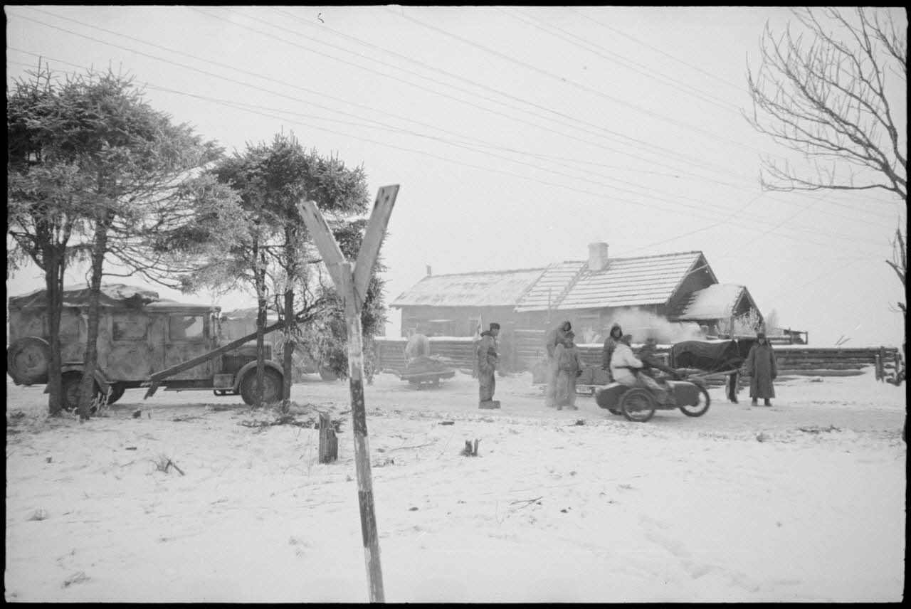 Un side-car et une ambulance Phänomen Granit quittent une isba proche d'une voie ferrée où circule le train blindé.