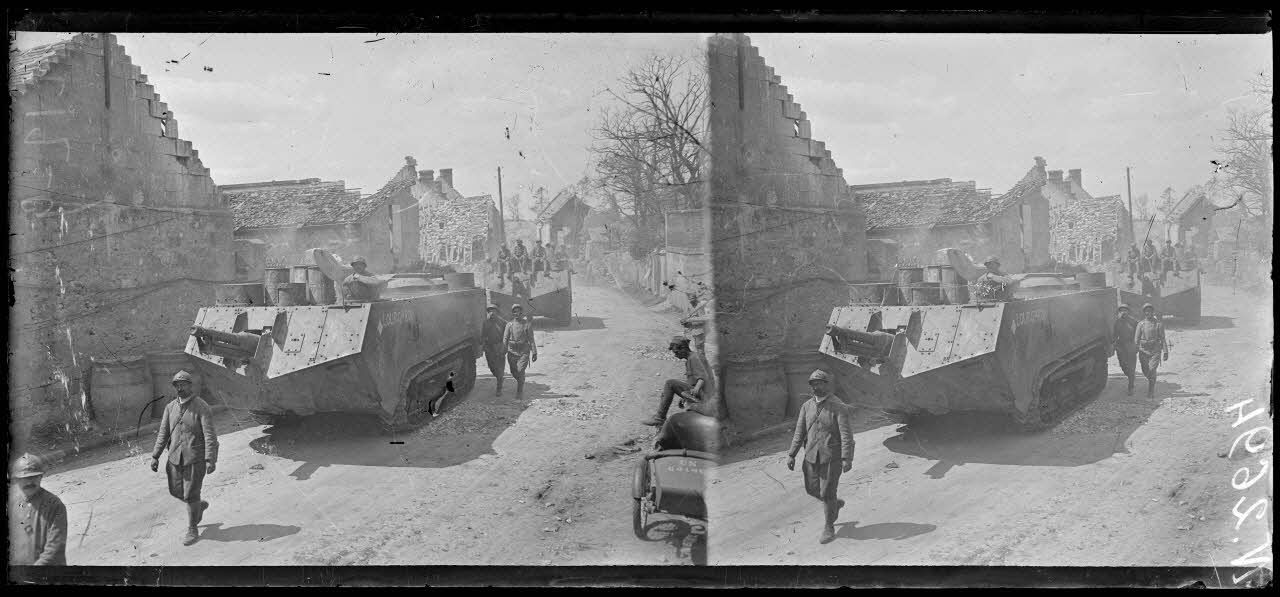 Dommiers (Aisne). Char d'assaut Saint-Chamond traversant le village. [légende d'origine]