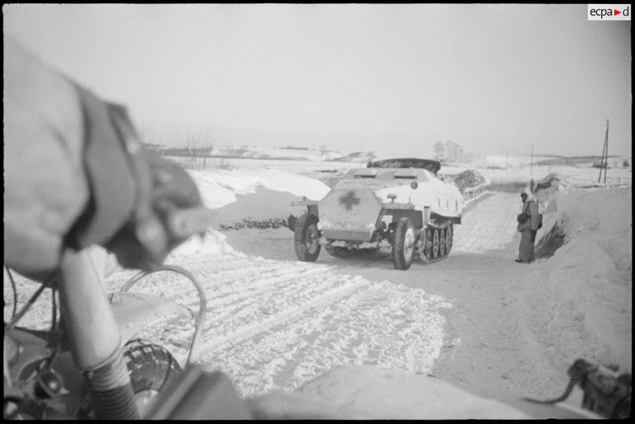 Un Sd.kfz. Sanitaire vu depuis le panier d'un side-car BMW R75.