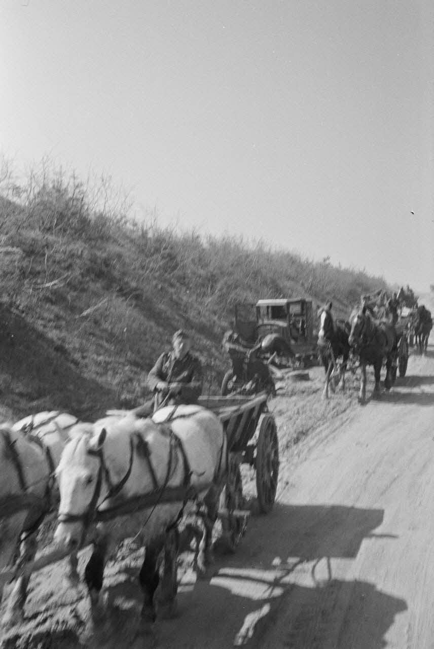 Un convoi hippomobile allemand croise les carcasses de véhicules de l'Armée rouge détruits.