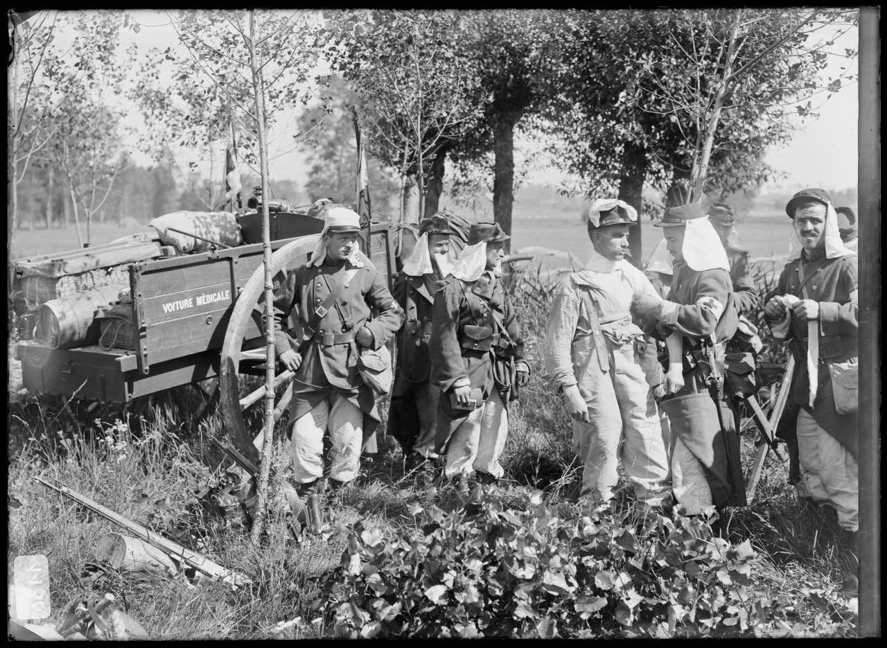 Un infirmier soigne un soldat du 103e RI, à l'arrière-plan, on distingue la voiture médicale attelée. [légende d'origine]