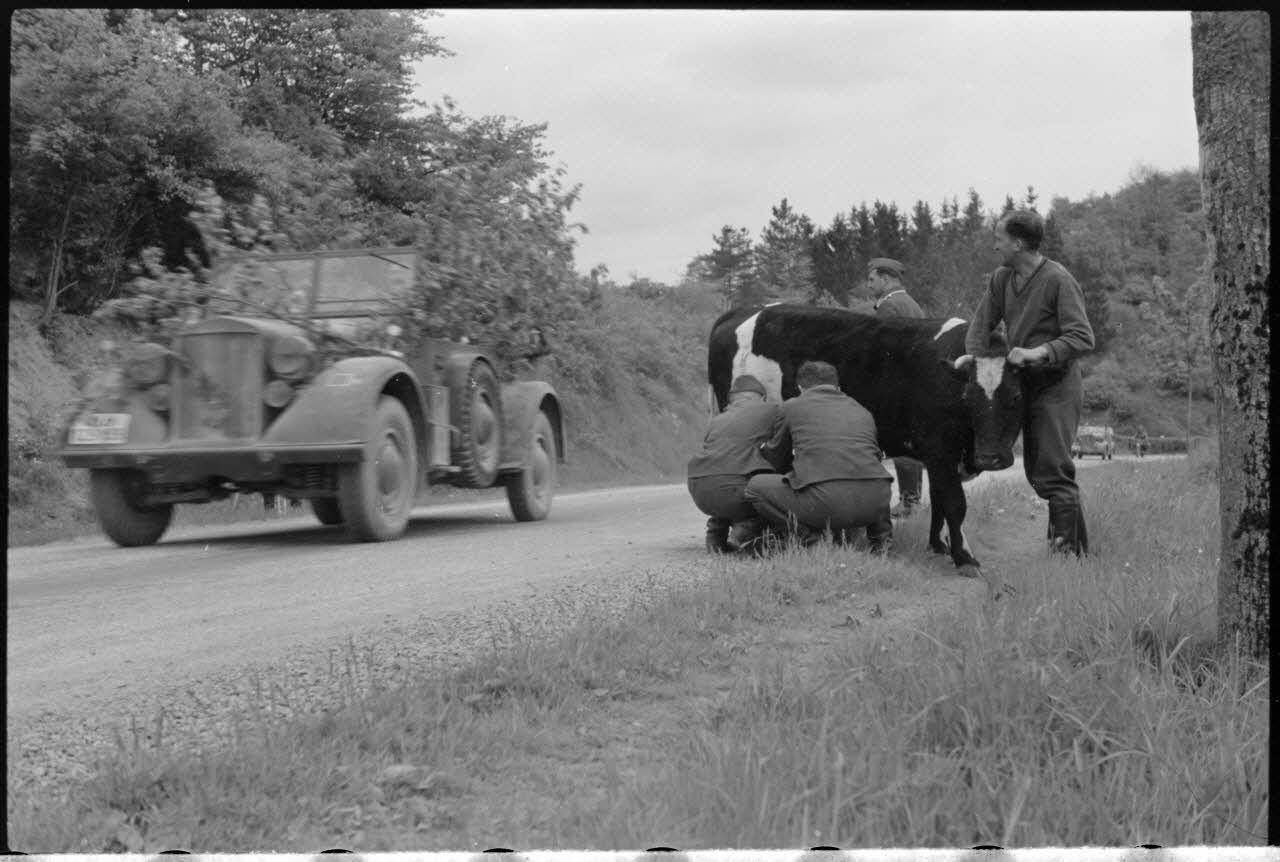 Traite d'une vache par des membres de la même compagnie de propagande, on reconnaît notamment le caméraman Hans Theyer. Le reporter porte le grade de Sonderführer (G pour Gruppenführer), grade équivalent à sous-officier. Convois allemands sur une route de Belgique.