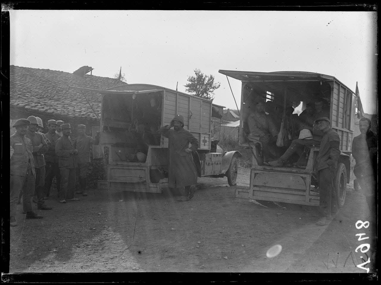 Ambulance alpine n°6 au moulin de Malovü. Départ de blessés et fiévreux pour Salonique. [légende d'origine]