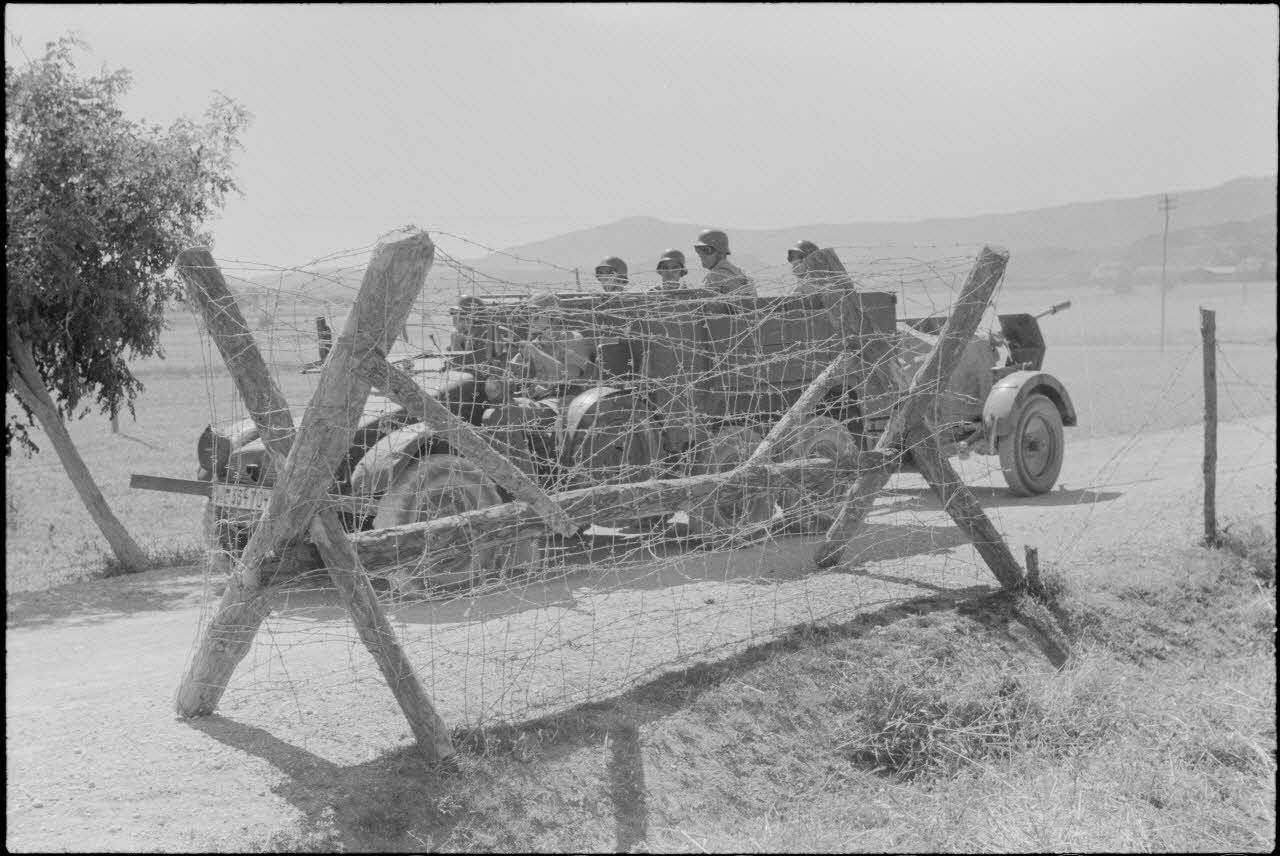Regroupés autour d'une pièce de 8,8 cm Flak, des artilleurs italiens reçoivent une formation sur cette pièce de DCA allemande devenue un canon antichar redouté par les alliés. Le cours porte sur l'utilisation du canon comme pièce antiaérienne. On remarque la présence de cadres de la Luftwaffe. Les artilleurs sont également formés sur le télémètre (Entfernungmesser 4mRH ou Kommandogerät) qui guide la batterie de FlaK. L'accent est également mis sur la mobilité du canon. Un semi-chenillé lourd (Sd.kfz.7) tracte la pièce. Une pièce de 2 cm Flak est tractée par un véhicule Krupp Protze Kfz.70.