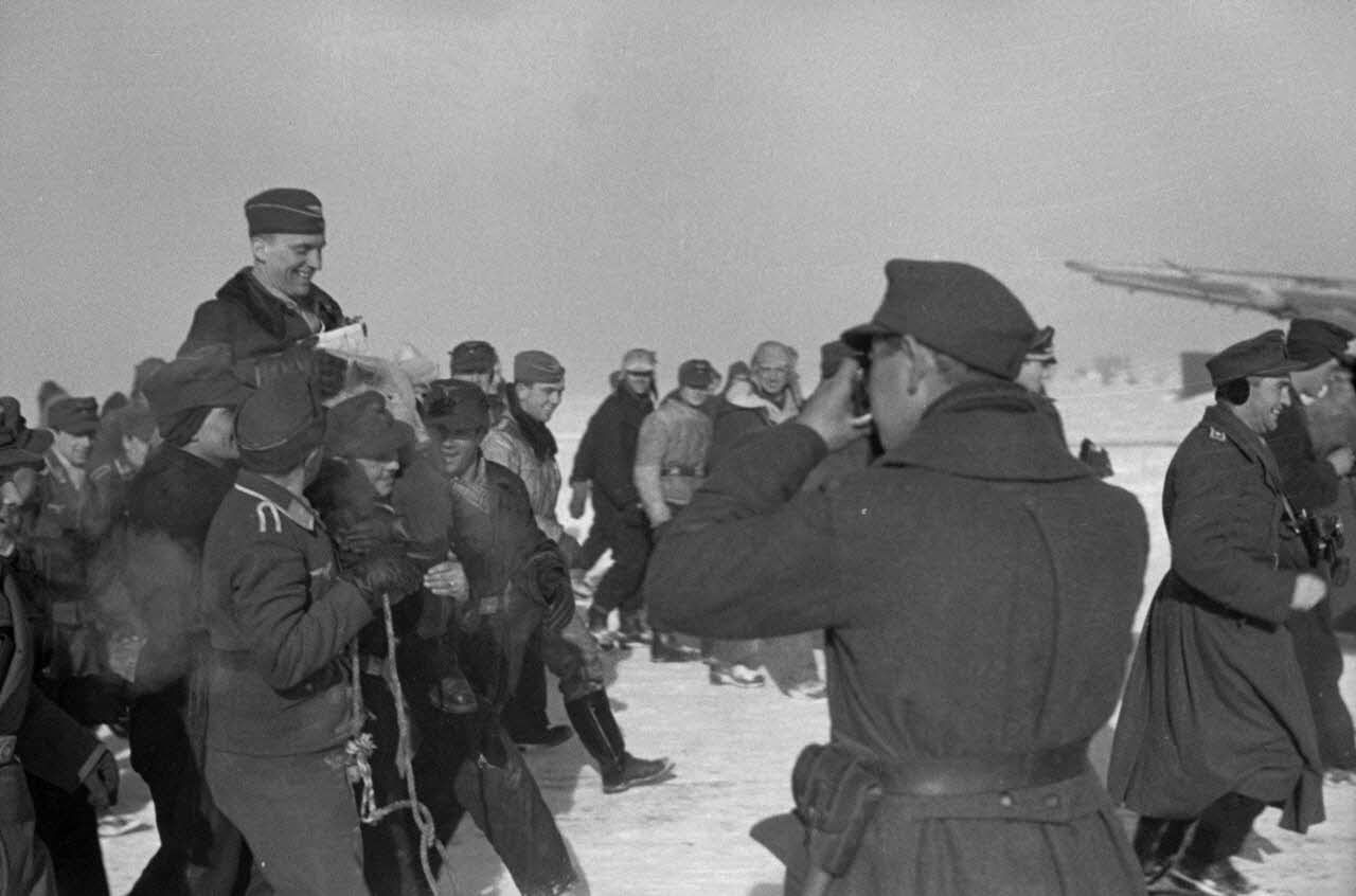 L'accueil réservé au pilote Hans Rudel pour le retour de sa 1 000e mission aérienne.