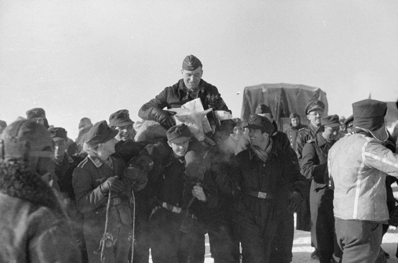 L'accueil réservé au pilote Hans Rudel pour le retour de sa 1 000e mission aérienne.