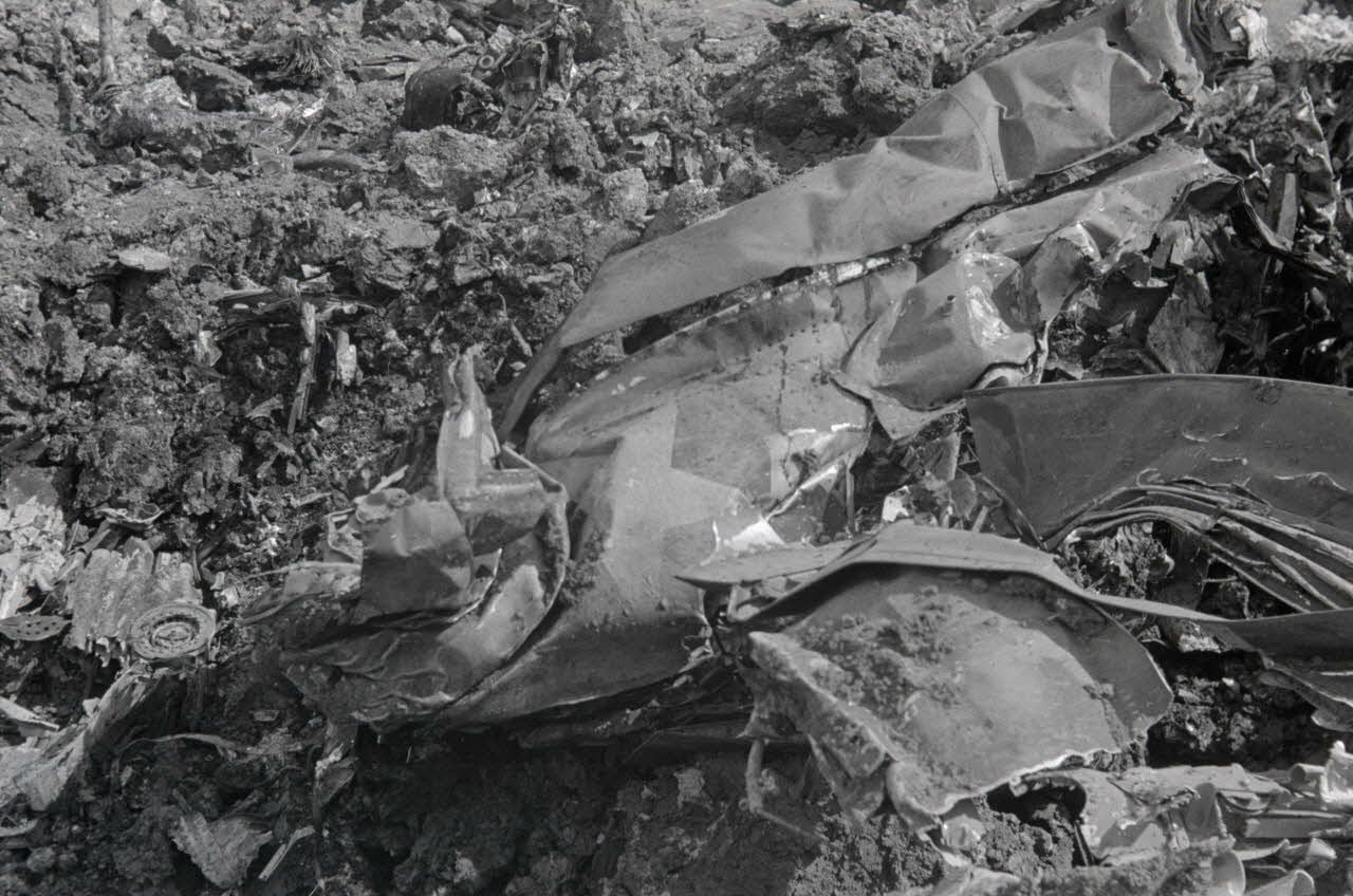 En Italie, dans le Latium, tombes de soldats allemands dans le secteur de Cassino et carcasse d'un bimoteur P-38 Lightning.