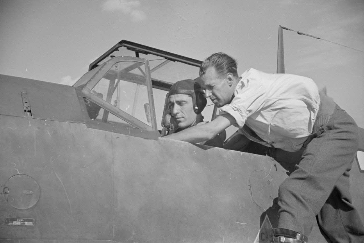 Alors que le moteur du Messerschmitt Bf-109 tourne déjà, le sous-officier Eberhard von Boremski, instructeur du Ergänzungsgruppe Süd, conseille un pilote.