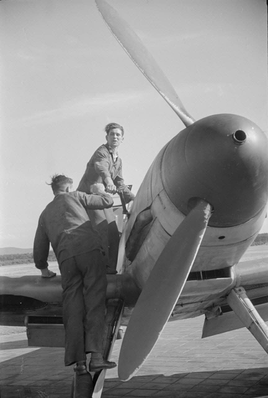 Alors que le moteur du Messerschmitt Bf-109 tourne déjà, le sous-officier Eberhard von Boremski, instructeur du Ergänzungsgruppe Süd, conseille un pilote.
