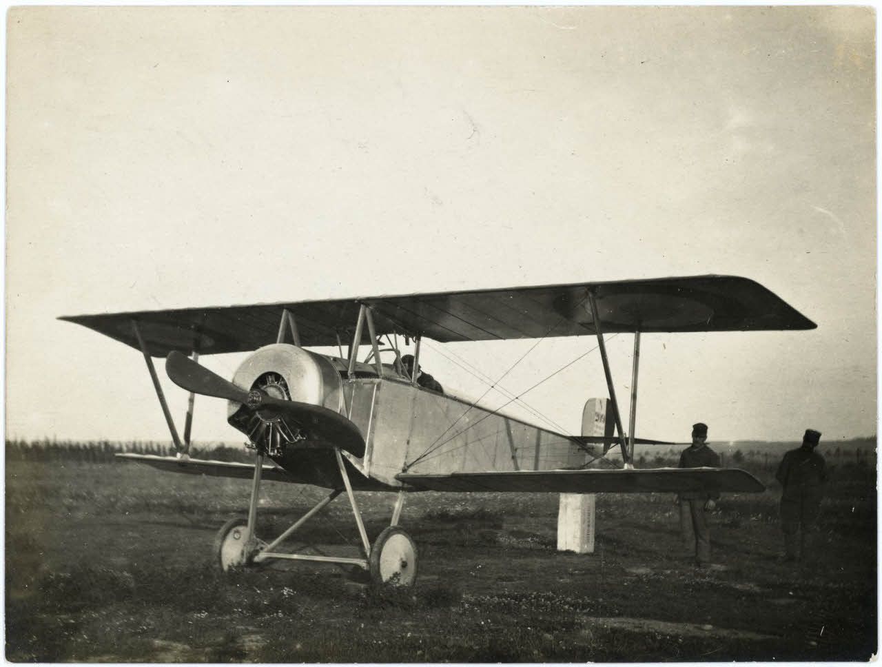 D169-6-98. Caporal Kugelstadt, pilote de l'escadrille MF 44, devant son appareil, qui se battit avec son observateur, le lieutena]t Luc Pupat, à coups de mitrailleuses contre les fantassins allemands au-dessus des tranchées du bois de Géréchamp.