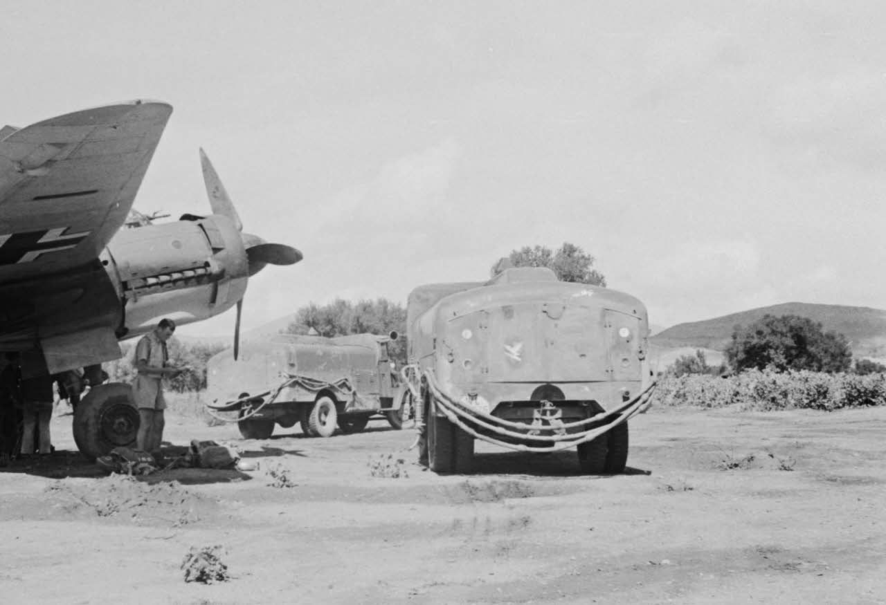 Tandis qu'un membre de l'équipage étudie la plan de vol sur une carte, le camion-citerne apporte le précieux ravitaillement en essence.