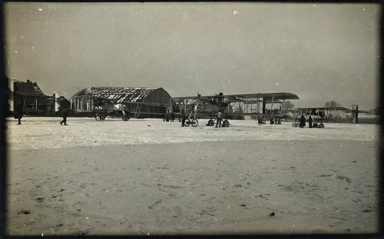 D169-6-64. [Avion Maurice Farman à Toul un jour de neige].