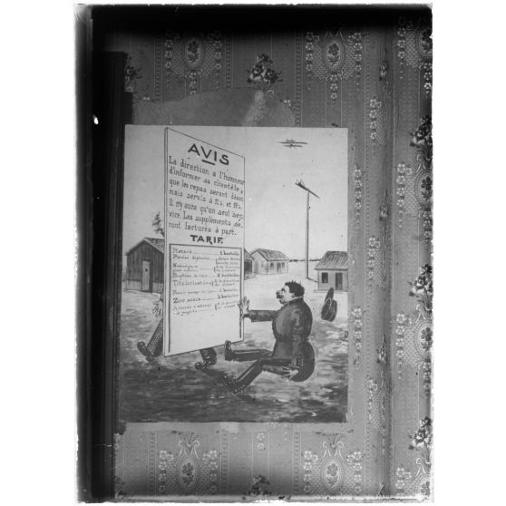 D169-10-15. [Affiche humoristique avertissant les punitions infligées aux aviateurs en cas de retard aux repas : Avis. La direction a l’honneur d’informer sa clientèle, que les repas seront désormais servis à 11 h. et 19h. Il n’y aura qu’un seul service. Les suppléments seront facturés à part].