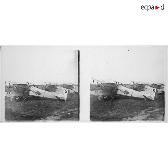 Vues du château de Bonneuil où sont installées les escadrilles N 79 et N 153 et plusieurs vues d'avions (Spad, Caudron), sur des terrains d'aviation.