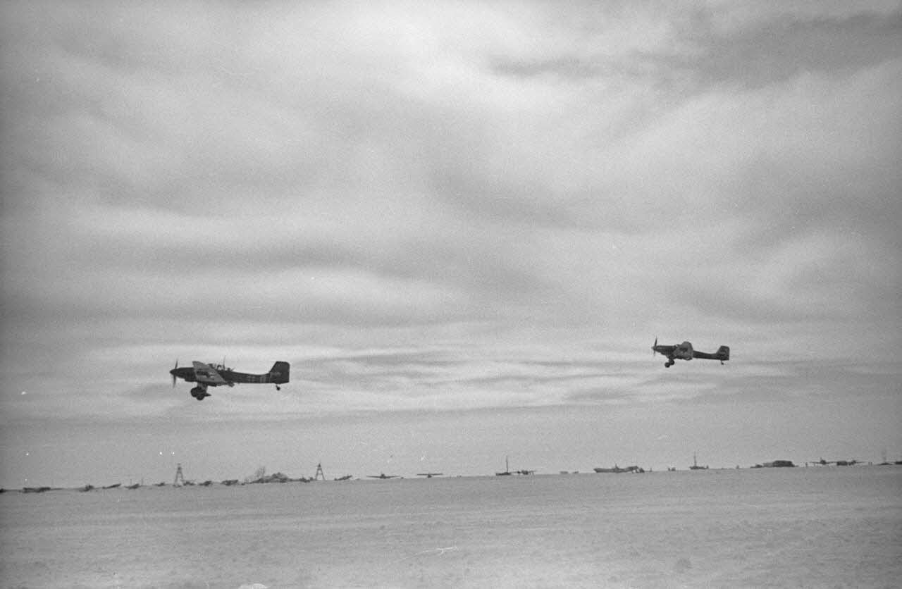 Ces Junkers Ju-87 « Stuka » D8 du I./StG2 «Immelmann » (Sturzkampf-Geschwader 2) sont soutenus par des Henschel 129 Hs-129 et escorté par des Messerschmitt Me-109 E et des Messerschmitt Me-110. La piste est recouverte de neige et le froid ajouté au vent rendent la vie des pilotes et des personnels au sol de la Luftwaffe très difficile.