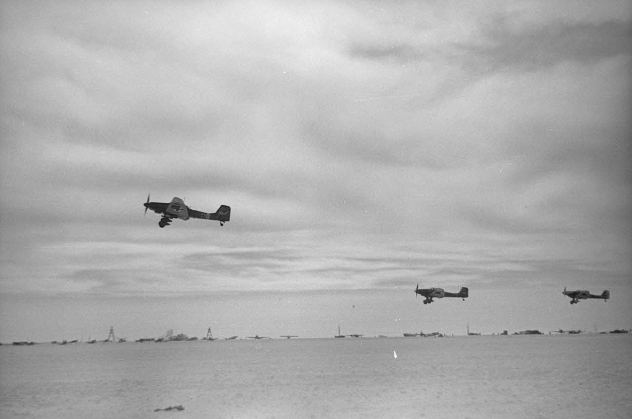 Ces Junkers Ju-87 « Stuka » D8 du I./StG2 «Immelmann » (Sturzkampf-Geschwader 2) sont soutenus par des Henschel 129 Hs-129 et escorté par des Messerschmitt Me-109 E et des Messerschmitt Me-110. La piste est recouverte de neige et le froid ajouté au vent rendent la vie des pilotes et des personnels au sol de la Luftwaffe très difficile.