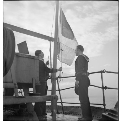 Pavillon français hissé sur le navire marchand allemand Rostock.