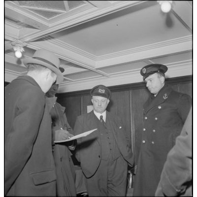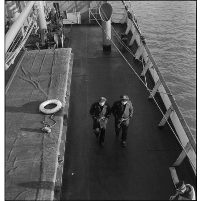 Marins français circulant sur le pont du navire marchand allemand le Rostock.