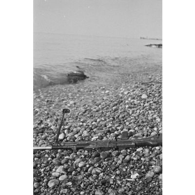 Un fusil-mitrailleur Bren sur la plage de Dieppe après le raid canadien (Opération Jubilee) du 19 août 1942.