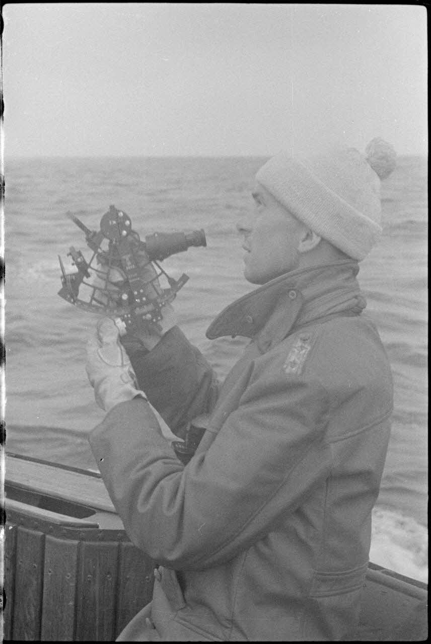 A bord d'un dragueur de mines de la classe 1940, un capitaine (Kapitänleutnant) utilise un sextant.