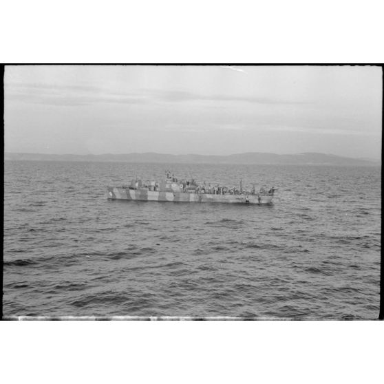 Un navire de surface de la 12.Räumbootsflottille, un insigne est visible sur la proue du bâtiment.