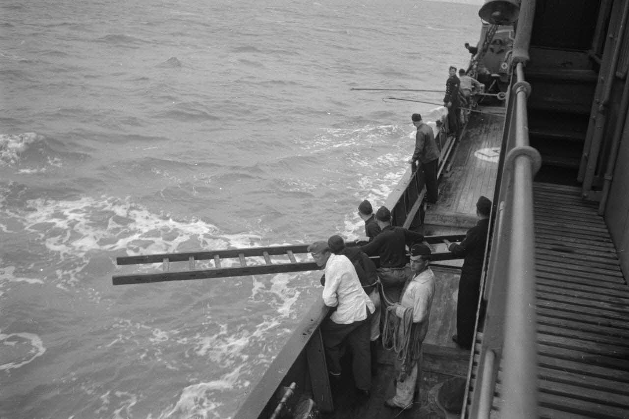 Depuis un dragueur de mines (Minensuchboot), un marin allemand récupère une bouée de sauvetage tombée à la mer.