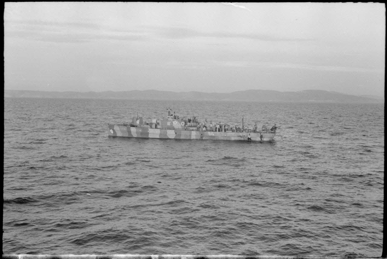 Sur l'île de Leros (Grèce), un bombardement aérien et les activités de dragueurs de mines allemands, peut-être la 12.Räumboot-Flottille de la Kriegsmarine.