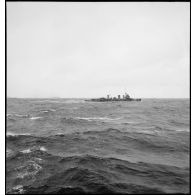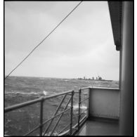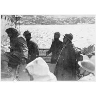 Des chasseurs alpins de la 5e DBCA (demi-brigade de chasseurs alpins) sont accoudés au bastingage du…