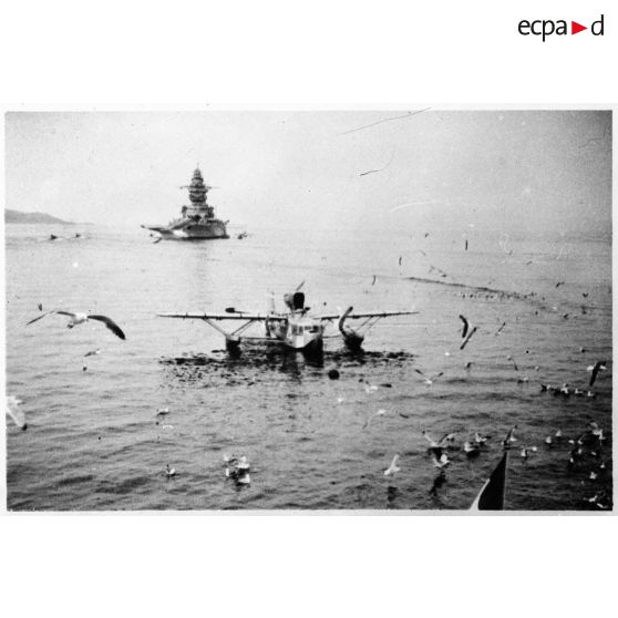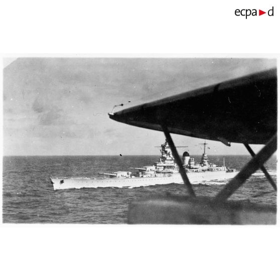 Vue bâbord du cuirassé Dunkerque depuis un hydravion de l'aéronauique navale.