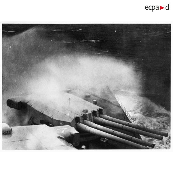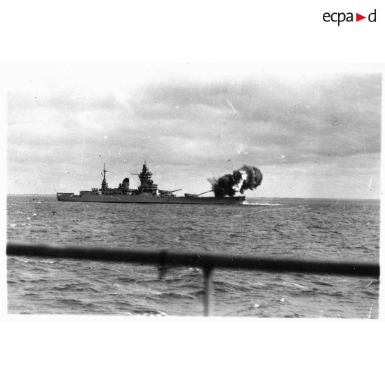 Tir des pièces de 330 mm sur la plage avant du cuirassé Dunkerque.