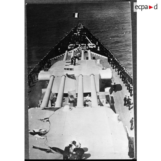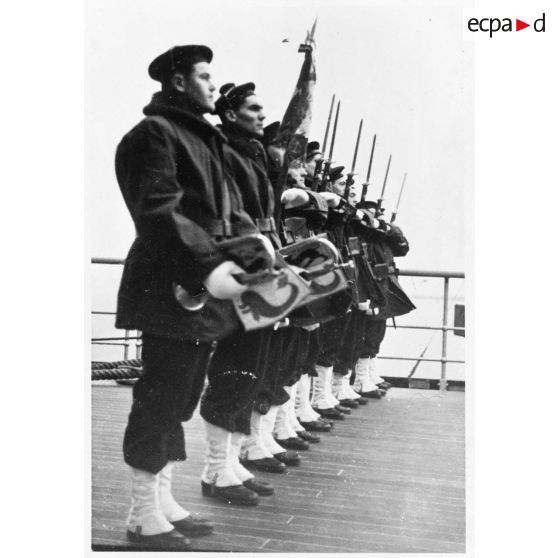 Piquet d'honneur de fusiliers marins sur le pont du cuirassé Dunkerque.