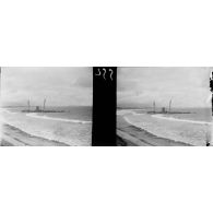Voilier en contre-jour et photographie du Victor Hugo, croiseur cuirassé de la marine française.…
