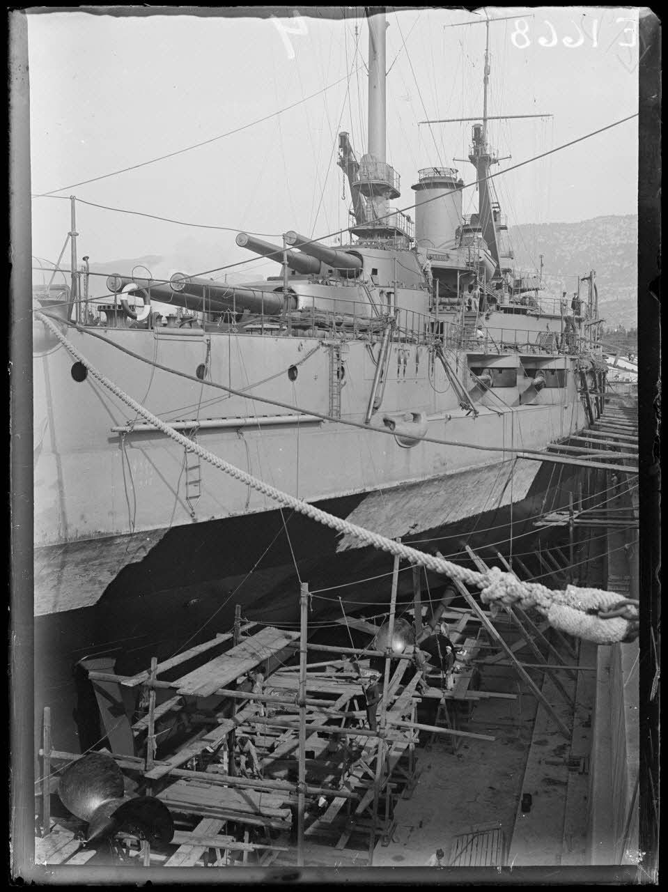 Toulon. Le "Jurien de la Gravière", croiseur de 1er ordre, rentre au bassin pour y être vérifié et réparé.