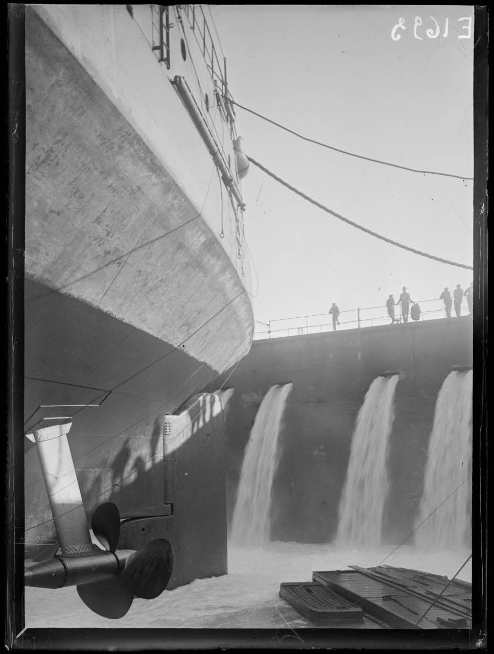 Toulon. Le "Jurien de la Gravière", croiseur de 1er ordre, rentre au bassin pour y être vérifié et réparé.