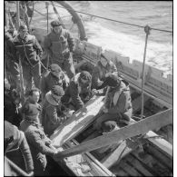 Vue en plongée sur une chaloupe d'un navire de la Royal Navy à bord de laquelle des chasseurs alpins…