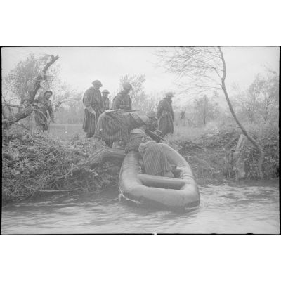 Les goumiers dans le canot passent d'une rive à l'autre.
