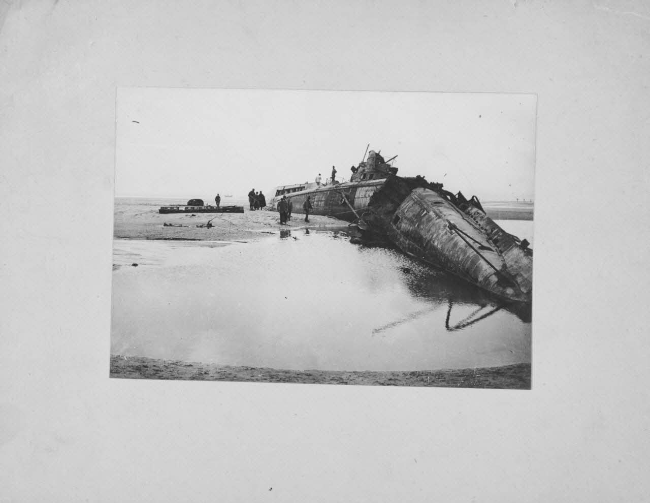 Légende d'origine : 05.86/14. Pas de Calais. Un sous-marin allemand échoué et détruit par son équipage.