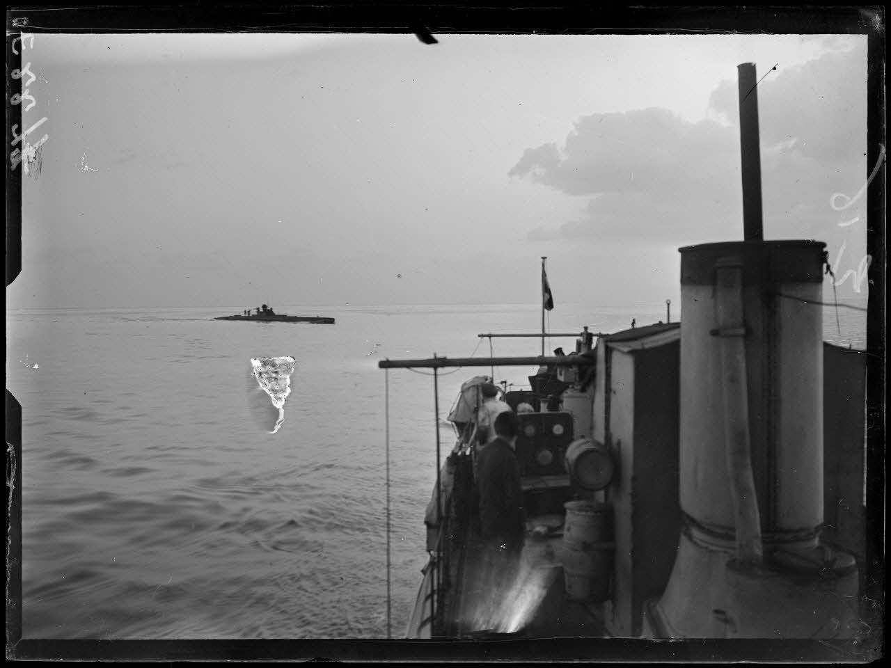 Toulon. A bord du torpilleur 270. Un sous-marin remontant de sa plongée. [légende d'origine]