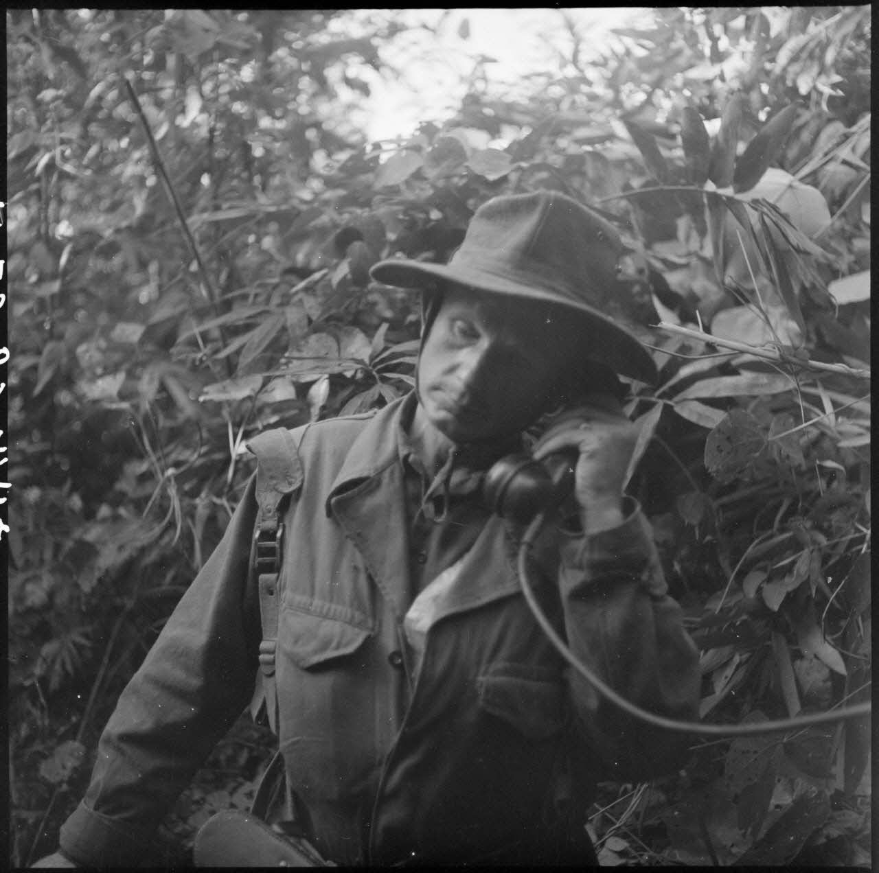 Le goumier Addou Ben Mohamed du 5e Tabor transmet des ordres depuis une position à Muong Khoua.