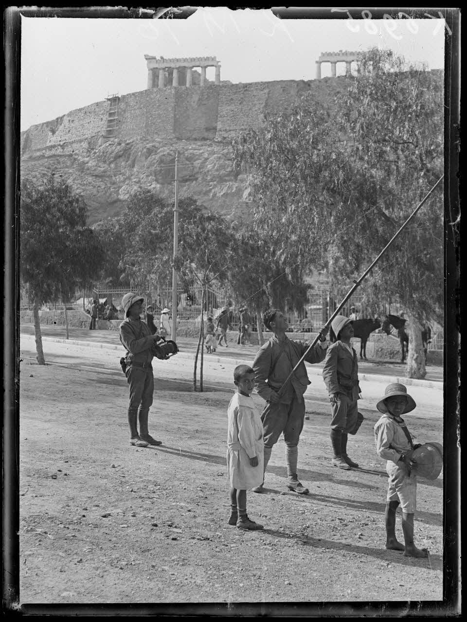 Athènes. Installation du téléphone au pied de l'Acropole. [légende d'origine]