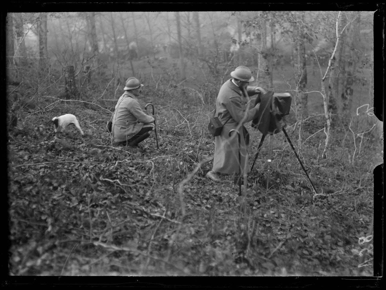 Près de son quartier général installé au lieu-dit de Saint-Roch en lisière de la forêt d'Argonne, le général Hennocque chef de la 39e brigade d'infanterie accompagne un opérateur de la SPA (Section photographique de l'armée) dans son reportage. L'opérateur à installé sa chambre photographique.