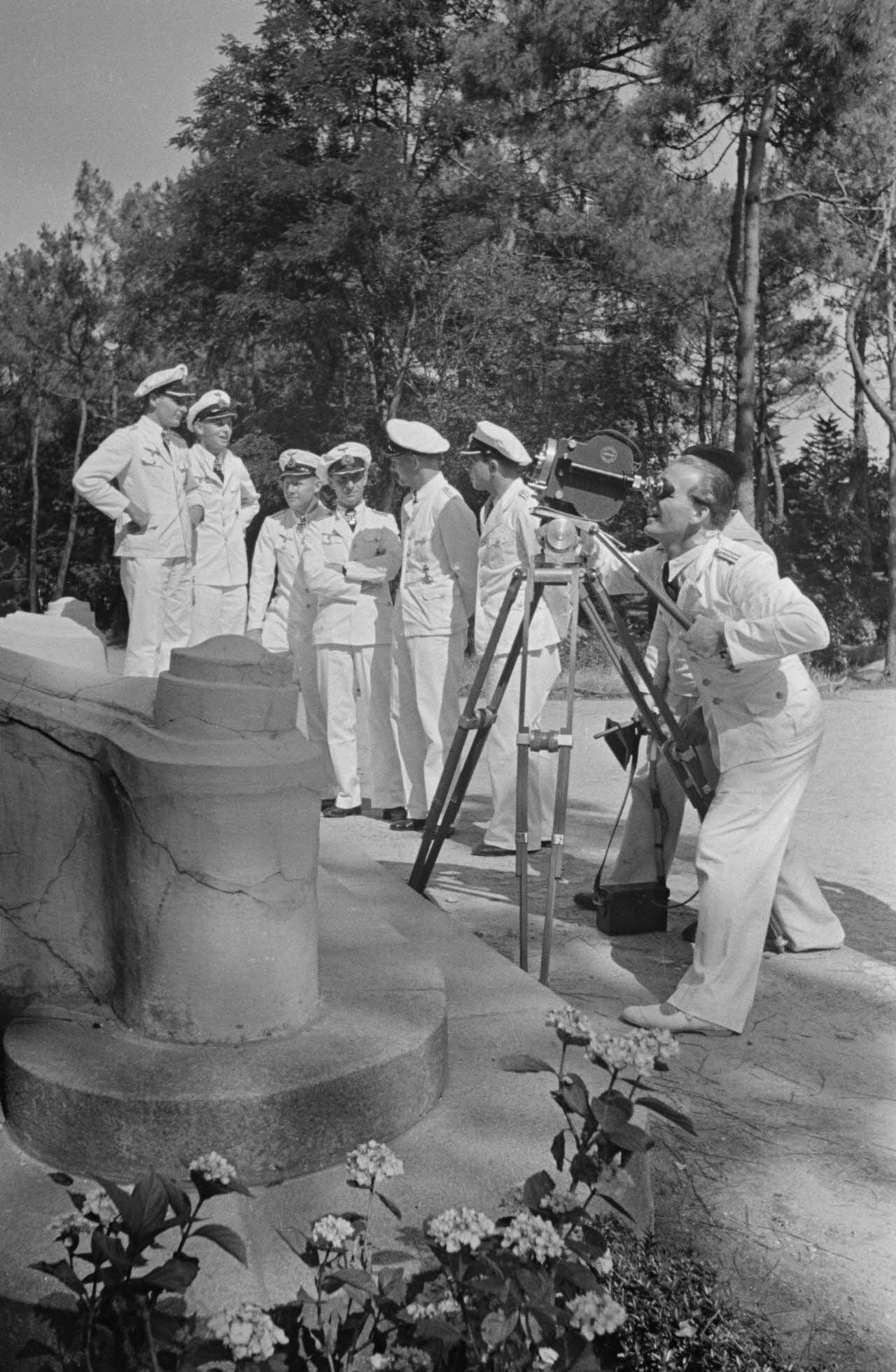 A l'hôtel Royal de La Baule où se tient une exposition de peintres de guerre, le caméraman Herbert Lander prépare sa caméra tchèque Cinephon 35 pour immortaliser la visite de commandants de U-Boot.