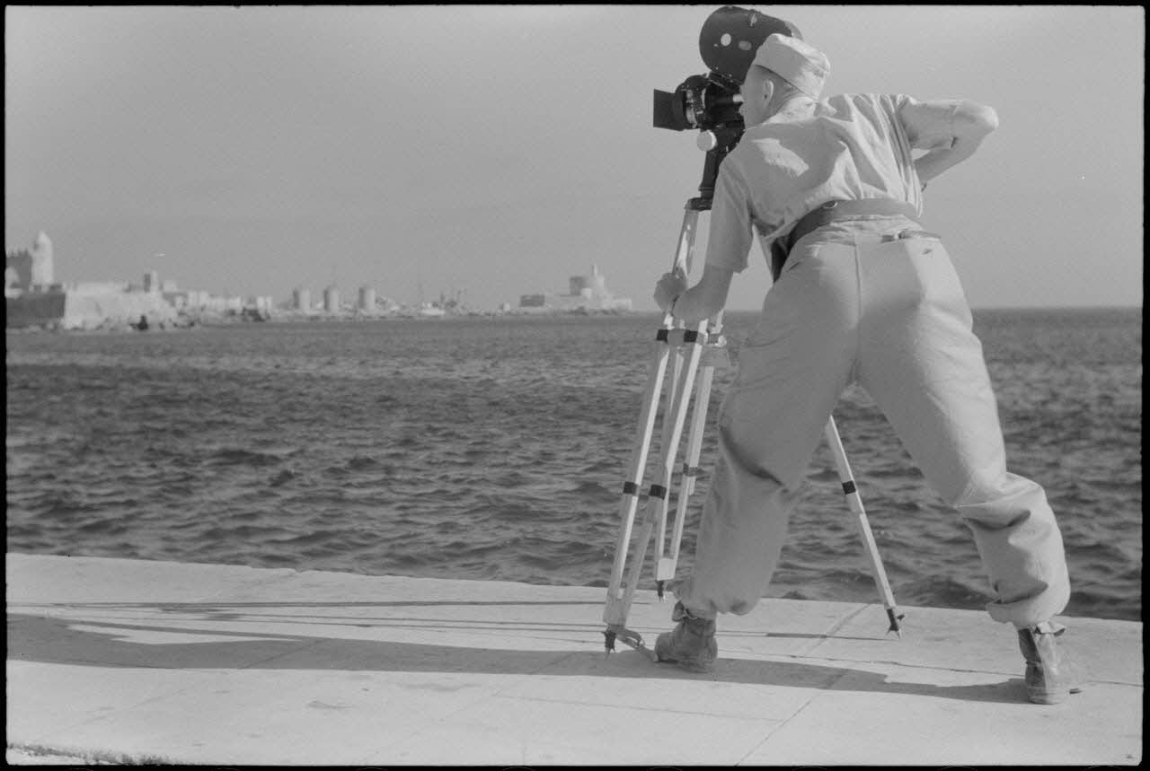 Le caméraman Hermann Dressler filme la ville de Rhodes à l'aide d'une Arriflex.