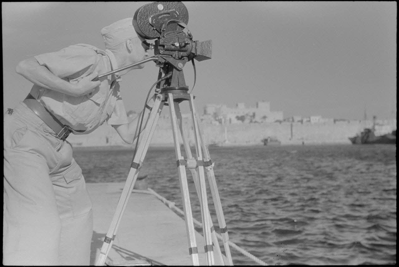 Dans le port de Rhodes, le Sonderführer (Z) Hermann Dressler, caméraman de la section de propagande Luftwaffe Kriegsberichter Abteilung Südost dispose son Arriflex 35 mm sur un pied et filme.