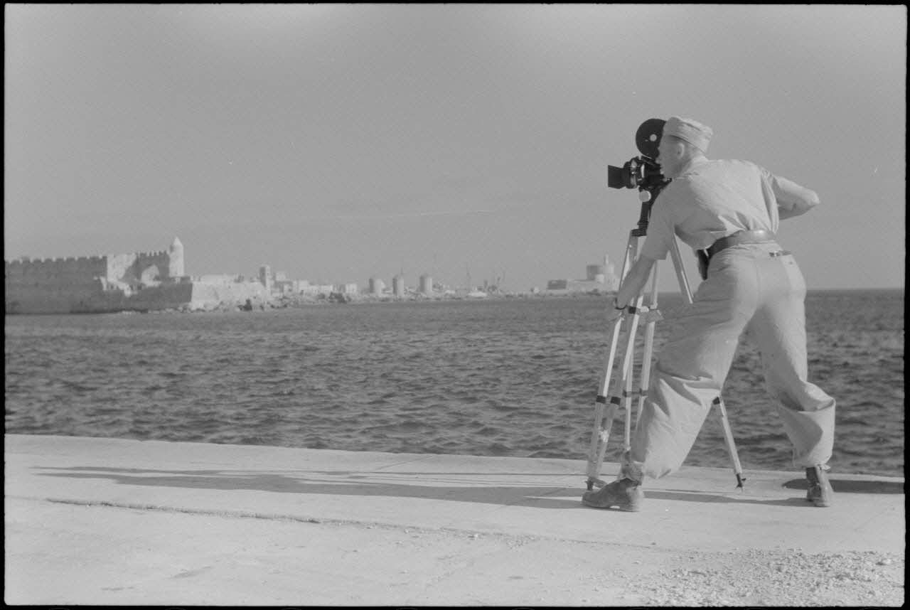 Dans le port de Rhodes, le Sonderführer (Z) Hermann Dressler, caméraman de la section de propagande Luftwaffe Kriegsberichter Abteilung Südost dispose son Arriflex 35 mm sur un pied et filme.