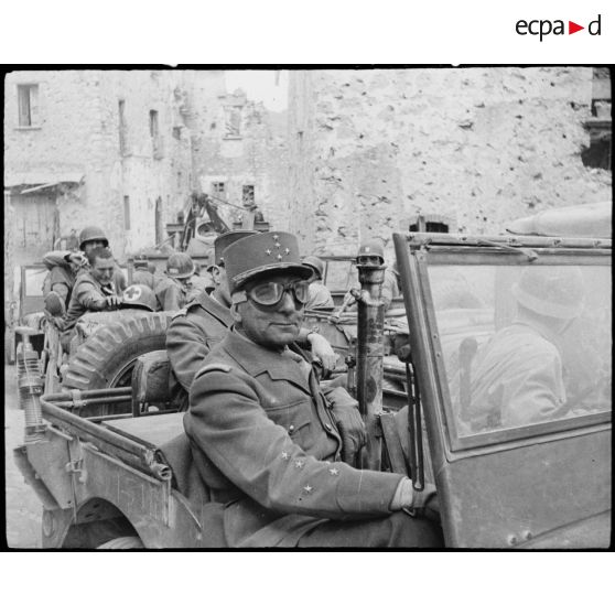 Le général de Lattre de Tassigny se déplace en jeep lors d'une visite sur le front.