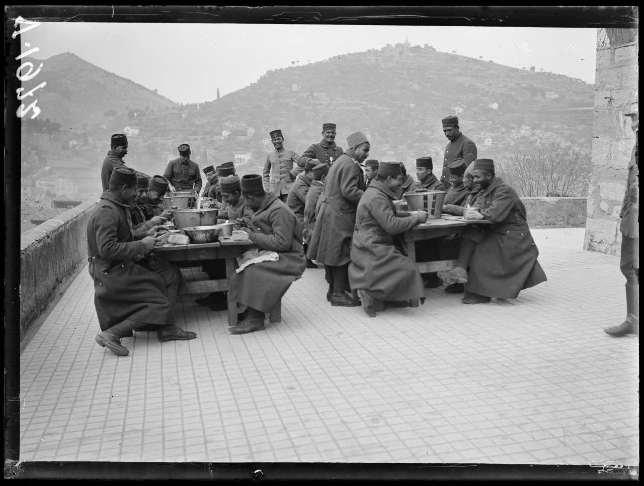 Des tirailleurs marocains prennent leur repas au fort Vauban.