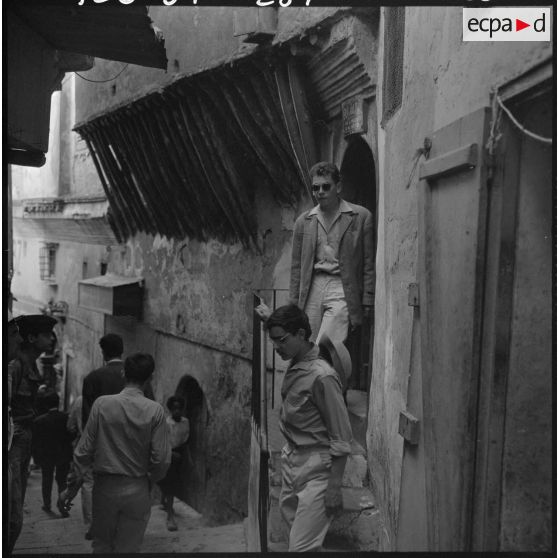 Le groupe d'étudiants et de personnalités civiles contemple la ville d'Alger depuis la terrasse d'une maison de la Casbah.