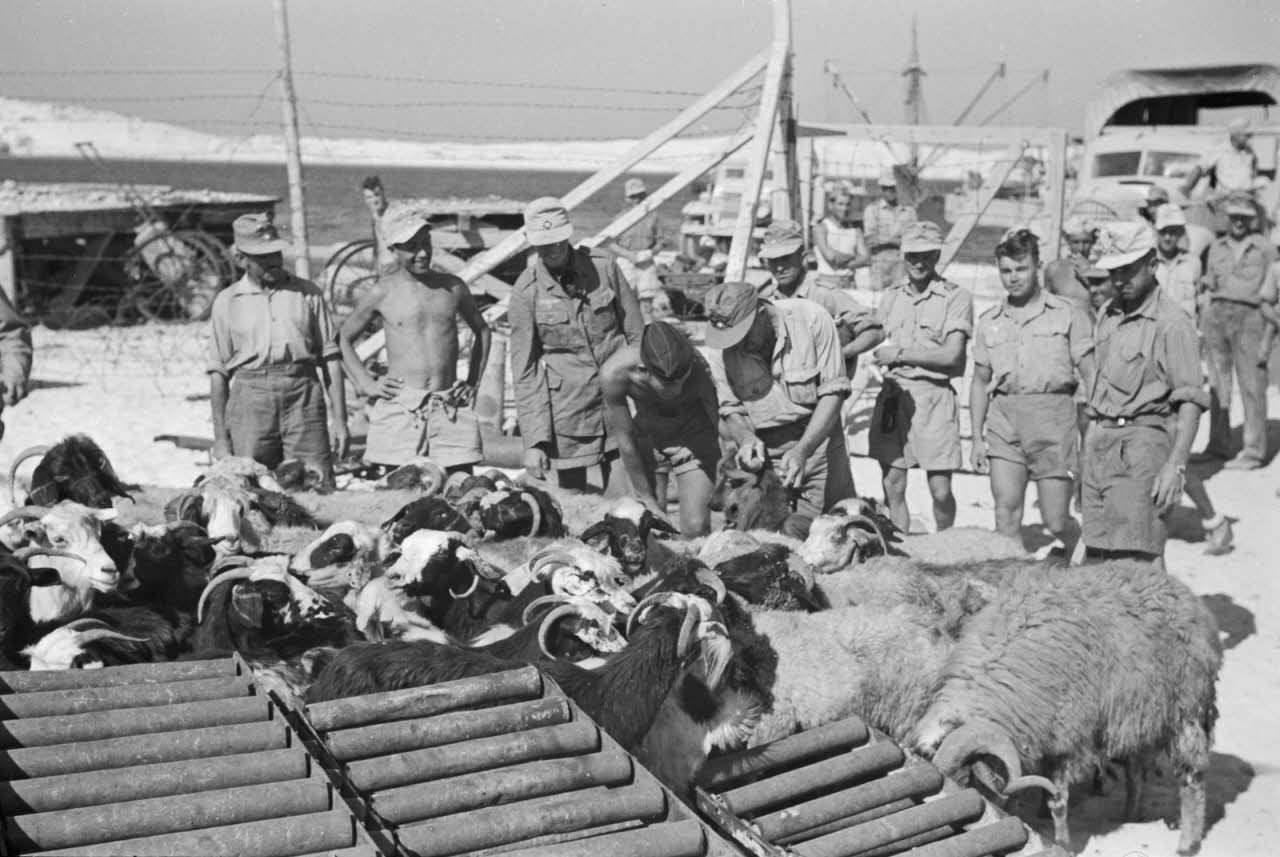 Dans le port de Marsa Matruh, des marins allemands de la Kriegsmarine débarquent un chargement de mouton et des chèvres. Les bêtes sont dirigées vers des enclos. La légende d'origine précise qu'il y également du poisson frais en plus de la viande, pour le grand plaisir des soldats.