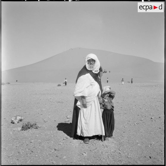 Robert Lecourt et la population de Béni Abbès. Portrait d'un homme avec un enfant.